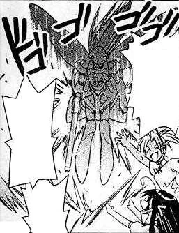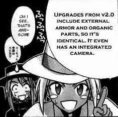 As with the manga version, this Mecha-Tama has a self destruct device but using it will result entire Tokyo(or maybe, the world) be destroyed. It has both an external umbilical power source and an internal battery power source. It was finally defeated by Motoko's sword technique.