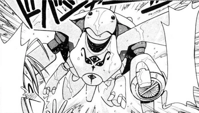 MT30 is a more refined variant of MT5. Due to its one panel appearance (Epilogue 1) it is unknown whether it is a mechanical android or another piloted mobile unit. More humanoid in form than previous Mecha-Tamas and has a large cannon on its right arm and possesses the ability of flight.
