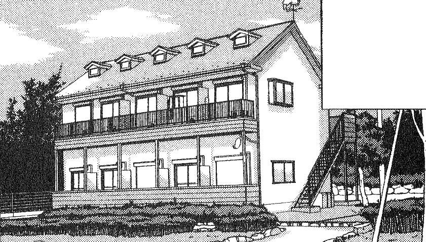 Mutsumi’s Apartment is a lodge situated across the road from the Hinata House with rented rooms for 12,000 yen each. The building is notable for its gold fish weathervane however it is located five feet from the train line (Mutsumi’s room has a door that opens directly onto the line).